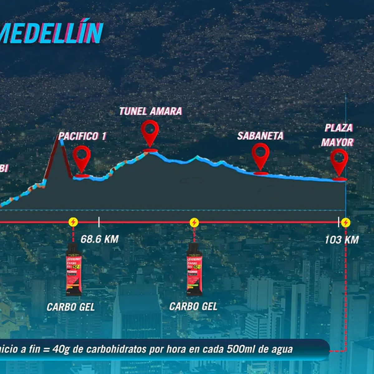 Si tu objetivo es cruzar la meta en 3h30, esta estrategia te aportará un promedio de 90g de carbohidratos por hora, y la hidratación necesaria desde inicio a fin.
